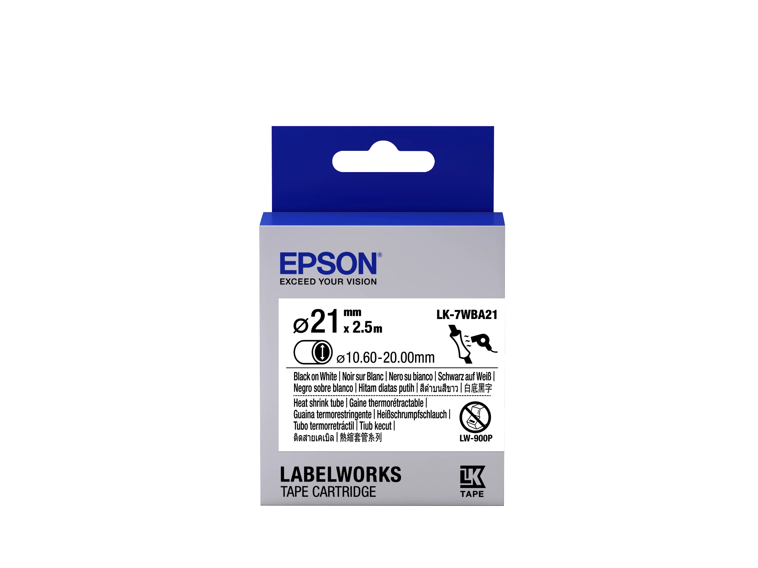 Epson LK-7WBA21 Black/White D21mm szalag(2.5m)2,5 m hosszú, fehér alapon fekete betűs hőre zsugorodó címkeszalag, átmérő: 21 mm |