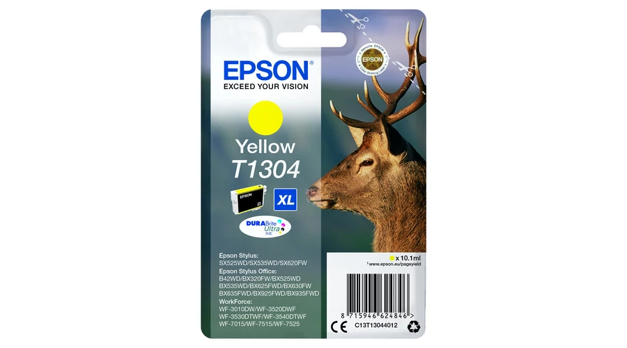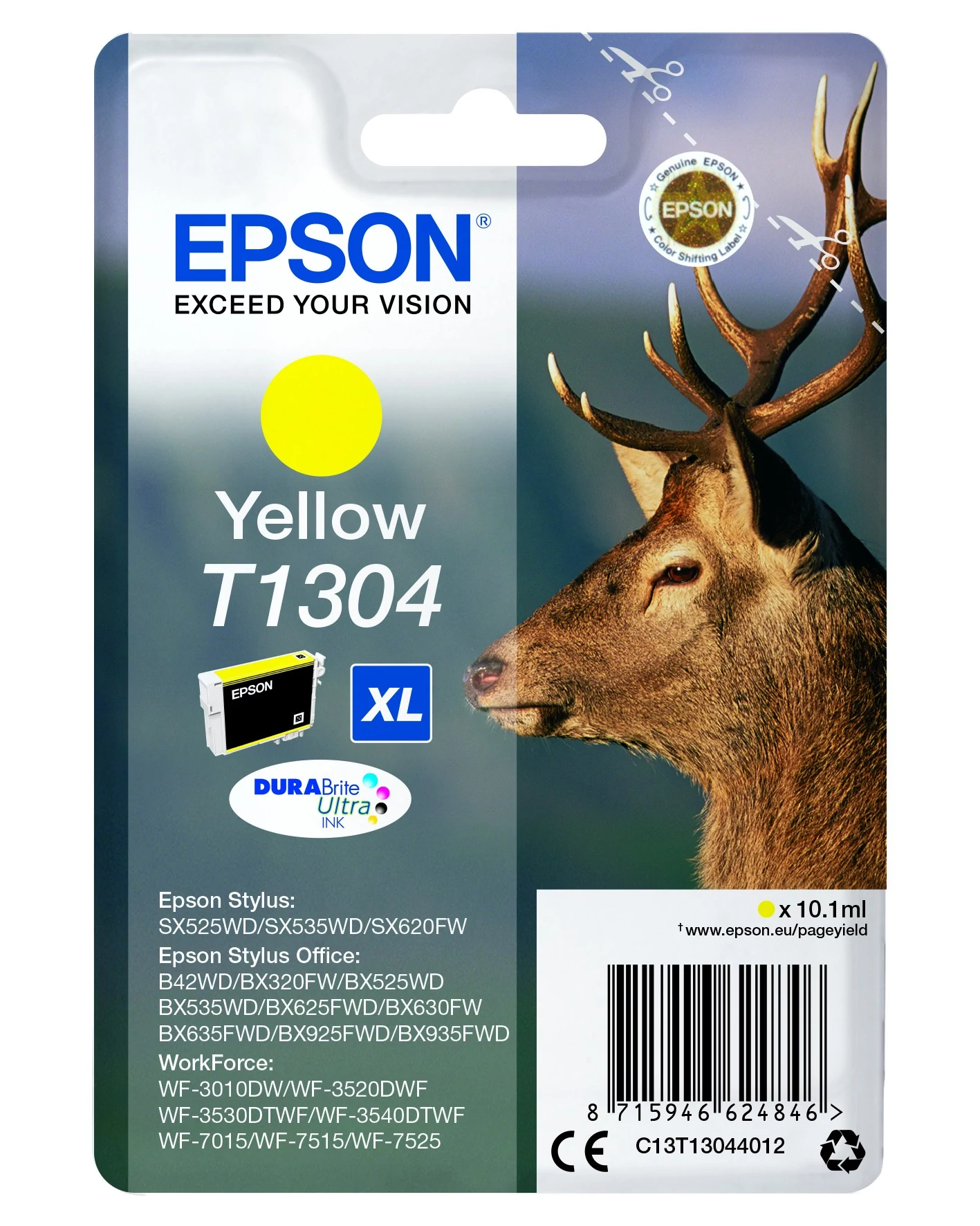 Epson T1304 Patron Yellow 10,1ml (Eredeti)Szarvasos Stylus Office SX525WD/SX620FW/BX525WD/BX625FWD/925FWD/B42WD/WF-3010DW/WF-3520DF/WF-3540DTWF/BX935FWD/BX535WD/WF-7525/SX620FWBX925FWD/WF7515/B42WD 1 x 25,4 ml Sárga |