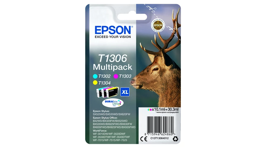 Epson T1306 Patron Multipack Három szín (Eredeti)Szarvasos CSAK A HÁROM SZÍN extra high capacity 3 x 10.1ml (CYAN,MAGENTA,YELLOW) SX525WD/SX620FW/BX525WD/BX625FWD/925FWD/B42WD/WF-3010DW/WF-3520DF/WF-3540DTWF/BX935FWD/BX535WD/WF-7525/SX620FWBX925FWD/WF7515/B42WD |
