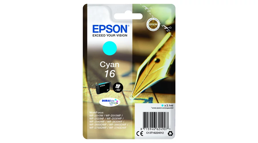 Epson T1622 Patron Cyan 3,1ml 16 (Eredeti)Töltőtoll 1 x 5,4 ml Cián 175 oldalra WorkForce 2010, 2510, 2520, 2530, 2540, 2750 |