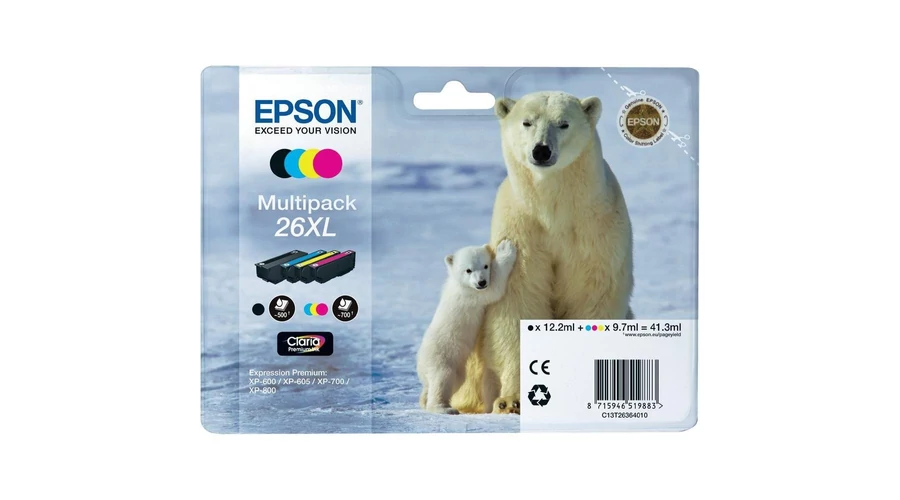 Epson T2636 Patron Multipack 26XL (Eredeti)Jegesmedve XP600 sorozat, XP700, XP800 1 x 12 ml Fekete, 1 x 10 ml Cián, 1 x 10 ml Sárga, 1 x 10 ml Bíbor |