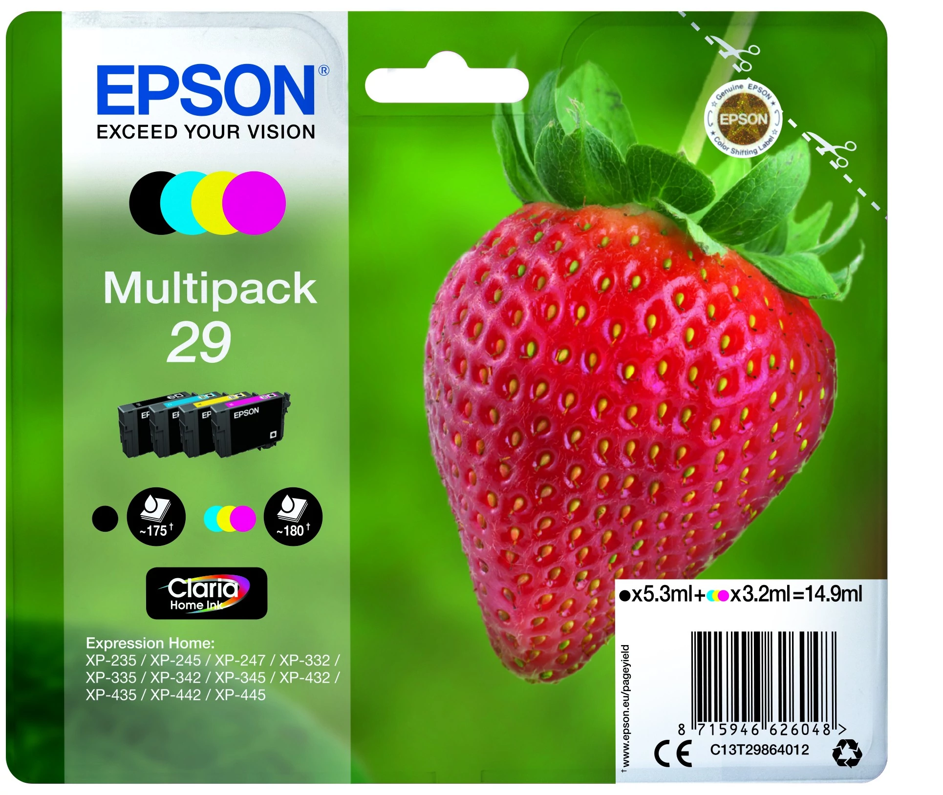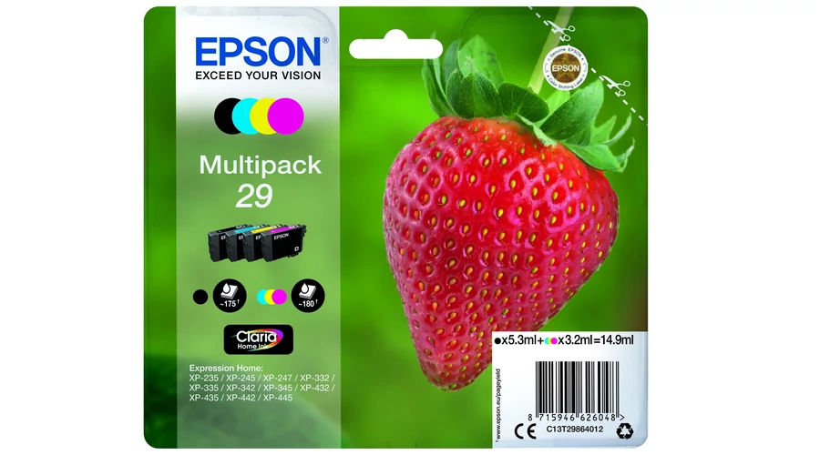 Epson T2986 Patron Multipack 29 (Eredeti)Epres Consumables: Ink Cartridges, Claria Home Ink, 29, Strawberry, Multipack, 1 x 3.2 ml Cyan, 1 x 3.2 ml Magenta, 1 x 5.3 ml Black, 1 x 3.2 ml Yellow, Standard |
