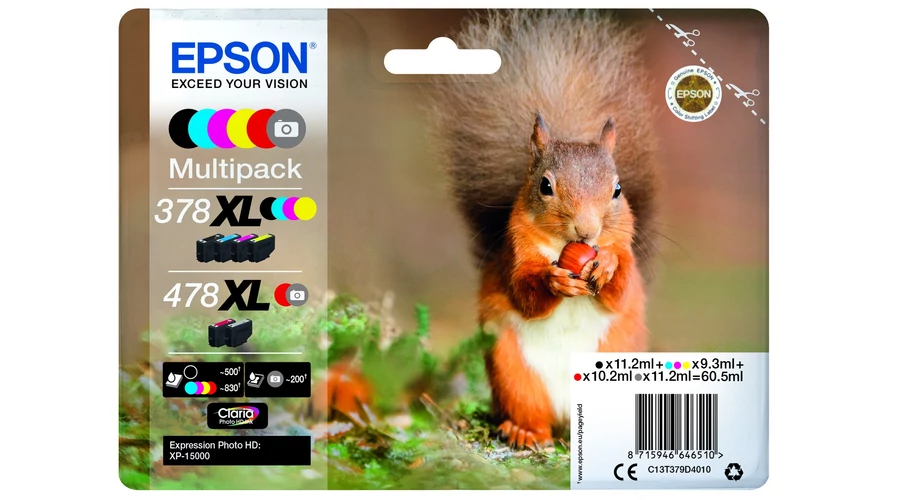 Epson T379D Patron Multipack 378XL + 478XL (Eredeti)XP-15000 Claria Photo HD Ink, 378XL+478XL, Squirrel Multipack, 1 x 11.2 ml Black, 1 x 9.3 ml Cyan, 1 x 9.3 ml Yellow, 1 x 9.3 ml Magenta, 1 x 10.2 ml Red, 1 x 11.2 ml Grey |